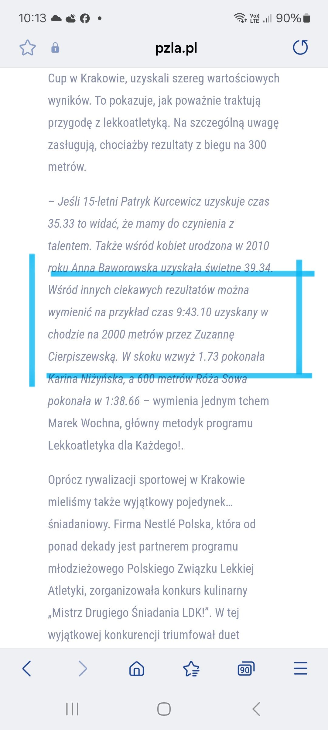 Zuzanna wygrała ten wyścig zdecydowanie. Druga na mecie straciła do niej 50 sekund. Na dystansie 2km jest to dużo. Zuza już od początku wypracowała sobie dużą przewag e i spokojnie, niezagrożona podążała do mety. Wynik 9.43,10 jest na tyle imponujący, że na stronie Polskiego Związku Lekkiej atletyki został wyróżniony, jako jeden z najciekawszych w zawodach.