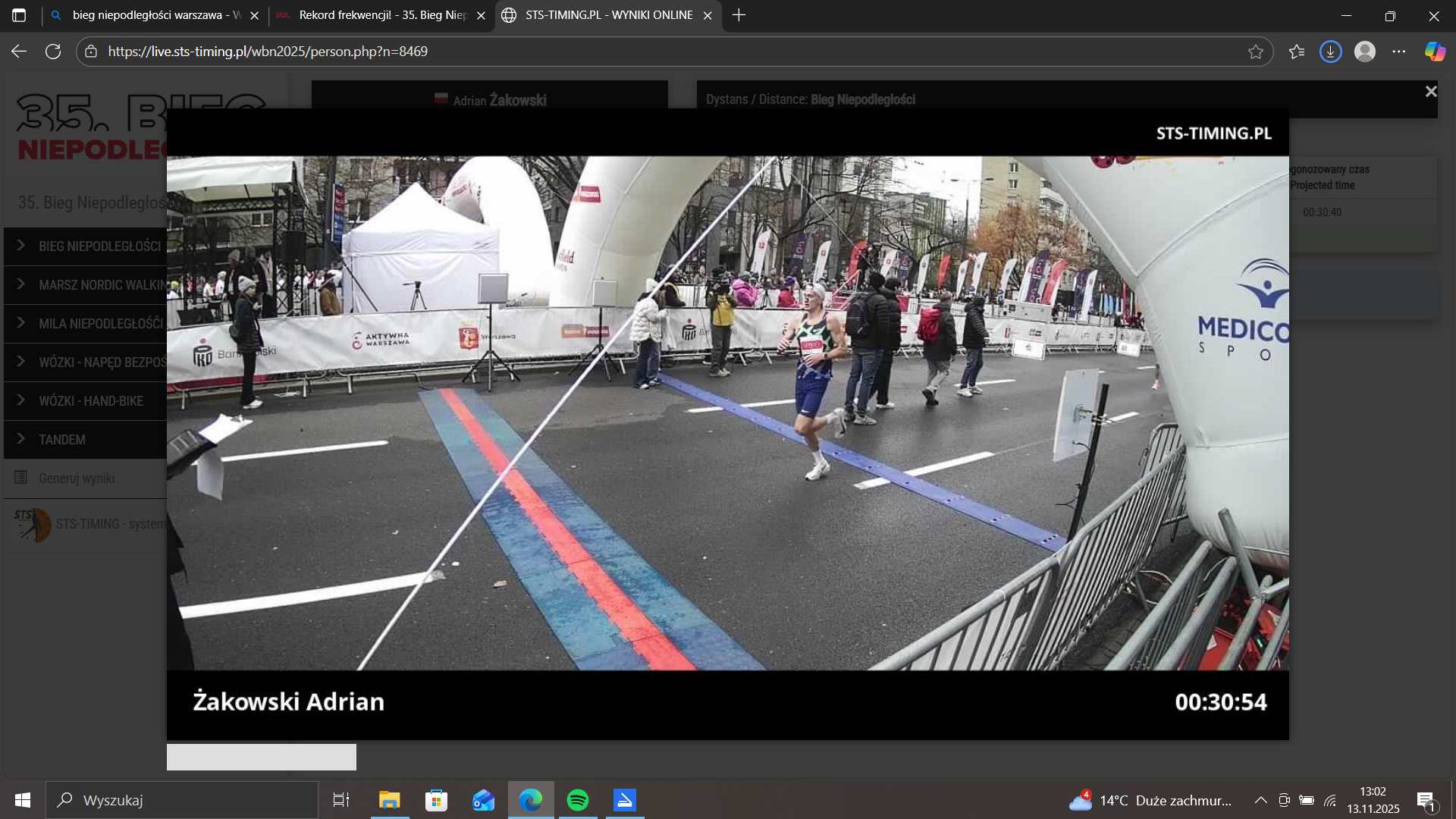 Nieoficjalnie czas byłby o 3 sekundy lepszy. Różnica wynika z faktu, że Adrian nie startował z pierwszej linii i te 3 sekundy to czas który upłynął od startu do przekroczenia linii startu. Cała siódemka rywali sklasyfikowana przed nim nie musiała się przedzierać po starcie i ma czas netto równy czasowi brutto. Biegacze wiedzą co to oznacza